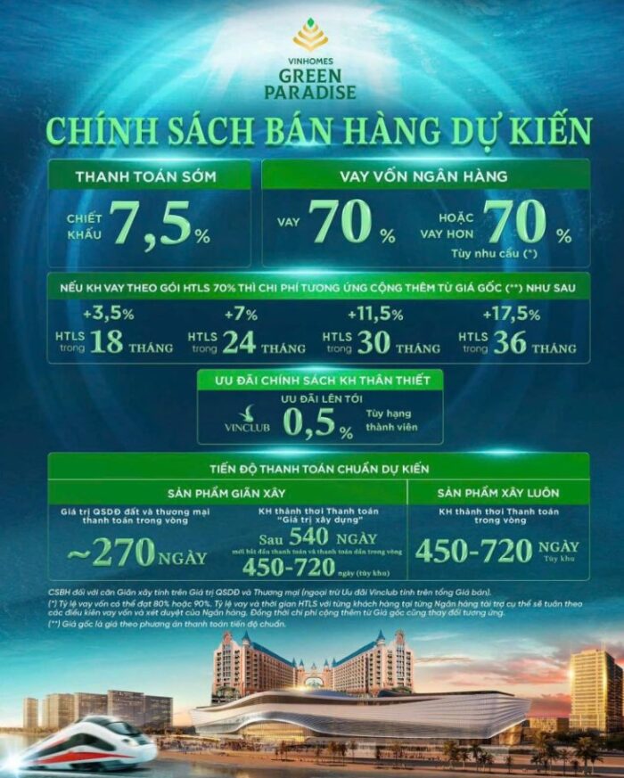 Vinhomes Green Paradise được quy hoạch bài bản với 4 phân khu chính (thường được gọi là các khu A, B, C và D-E), mỗi nơi đảm nhận một vai trò riêng biệt từ nghỉ dưỡng, giải trí đến tài chính và thương mại. Đây là dự án đại đô thị lấn biển đầu tiên tại TP.HCM áp dụng tiêu chuẩn ESG++ (Môi trường – Xã hội – Quản trị), ưu tiên không gian xanh và mặt nước lên đến 70% tổng diện tích. Với tổng vốn đầu tư dự kiến hơn 10 tỷ USD, dự án hứa hẹn tạo ra một hệ sinh thái “all-in-one” bao gồm bến du thuyền 6 sao, tháp tài chính 108 tầng, sân golf quốc tế và các khu vui chơi giải trí quy mô hàng đầu khu vực.