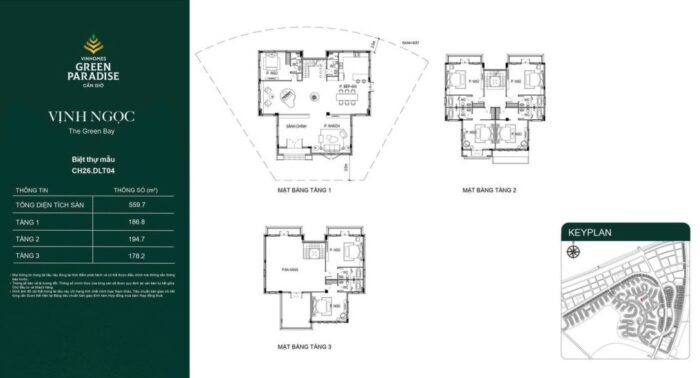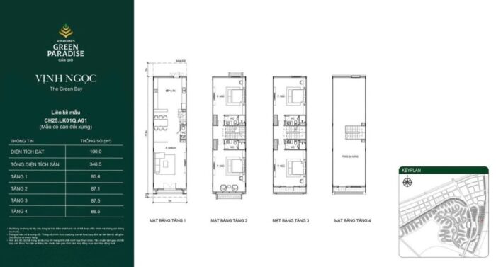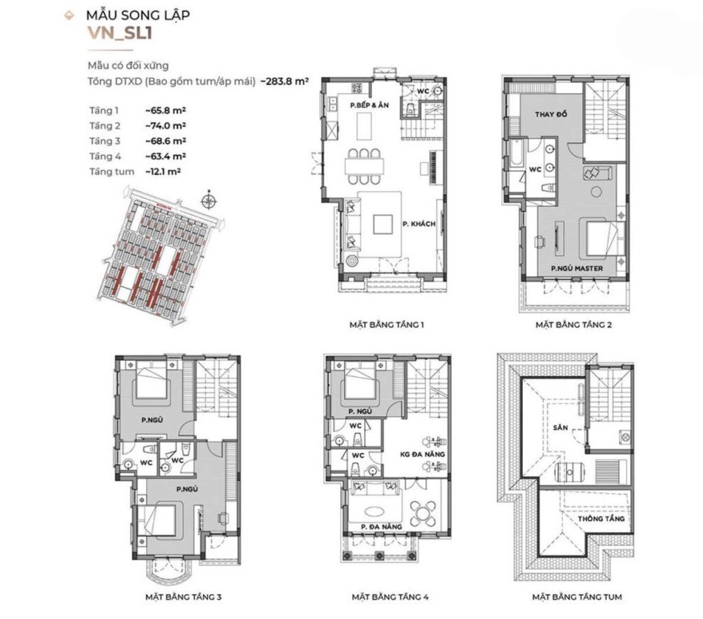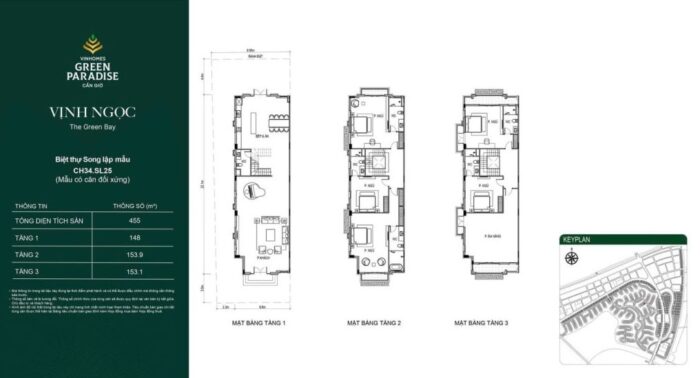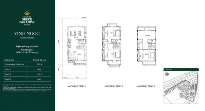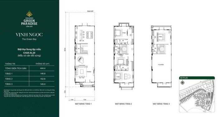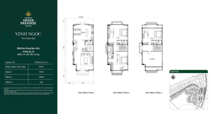 Biệt thự song lập có diện tích từ 250m2, thiết kế 3 tầng với 3 mặt thoáng. Layout chú trọng vào không gian phòng khách liên thông bếp, tạo sự rộng rãi và kết nối trực tiếp với sân vườn bên hông căn nhà.