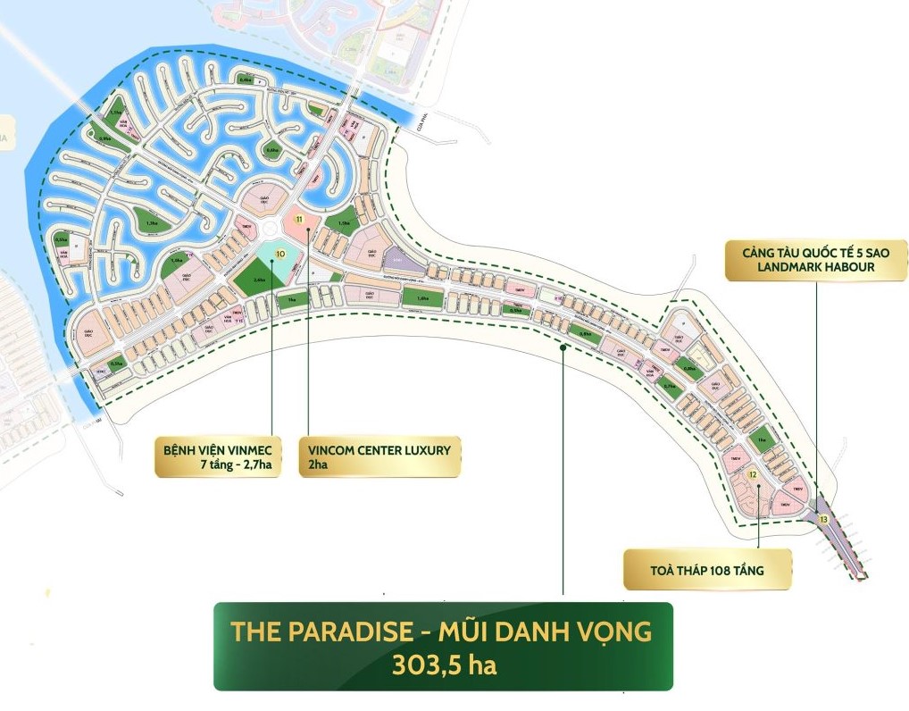 Mặt bằng The Paradise quy mô 318 ha được quy hoạch cực kỳ đặc sắc với hình dáng của một mũi tên vươn khơi. Khu vực trung tâm là tổ hợp tháp tài chính và Vincom Center Luxury. Bao quanh lõi trung tâm là các khu căn hộ hạng sang (Branded Residences) được quản lý bởi các thương hiệu khách sạn hàng đầu thế giới.
