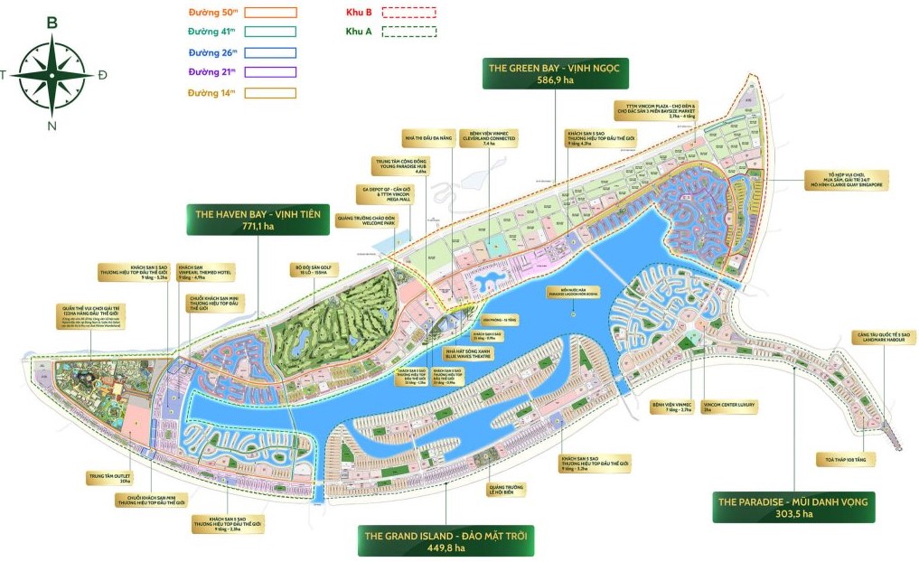Điểm nhấn của mặt bằng tổng thể là sự phân bổ thông minh giữa các khu vực ở, khu vui chơi giải trí VinWonders, sân golf và các trung tâm tài chính cao tầng. Với mật độ xây dựng thấp, phần lớn diện tích mặt bằng được dành cho hệ thống kênh đào dẫn nước biển vào nội khu, các công viên chuyên đề và hành lang xanh bảo tồn đa dạng sinh học. Điều này giúp điều hòa khí hậu toàn khu đô thị, mang lại môi trường sống trong lành và tầm nhìn khoáng đạt cho mọi loại hình bất động sản tại đây.