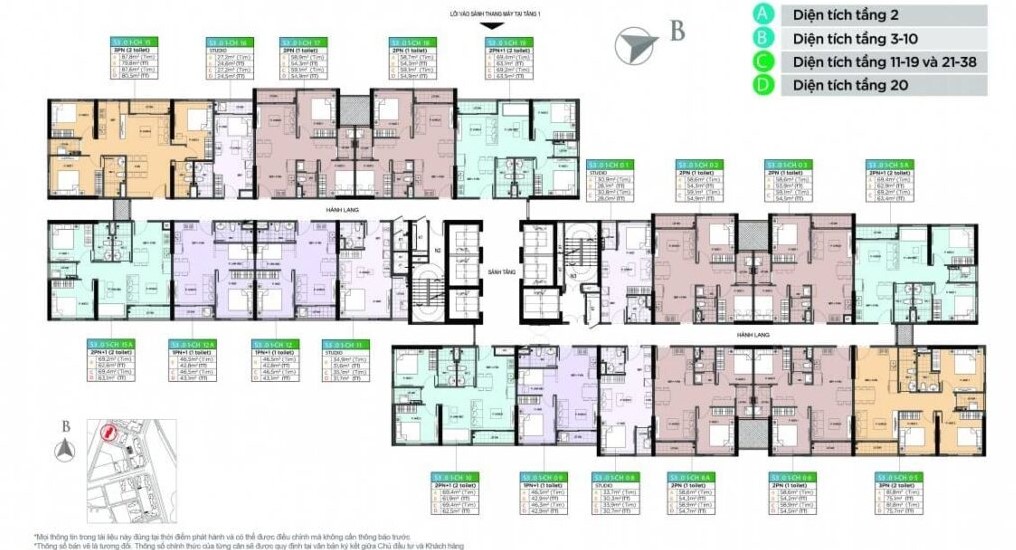 Mặt bằng dự án được chia thành 5 phân khu chính (A, B, C, D, E), mỗi khu vực mang một màu sắc kiến trúc và chức năng riêng biệt, tạo nên một “thành phố trong lòng thành phố” vận hành nhịp nhàng.