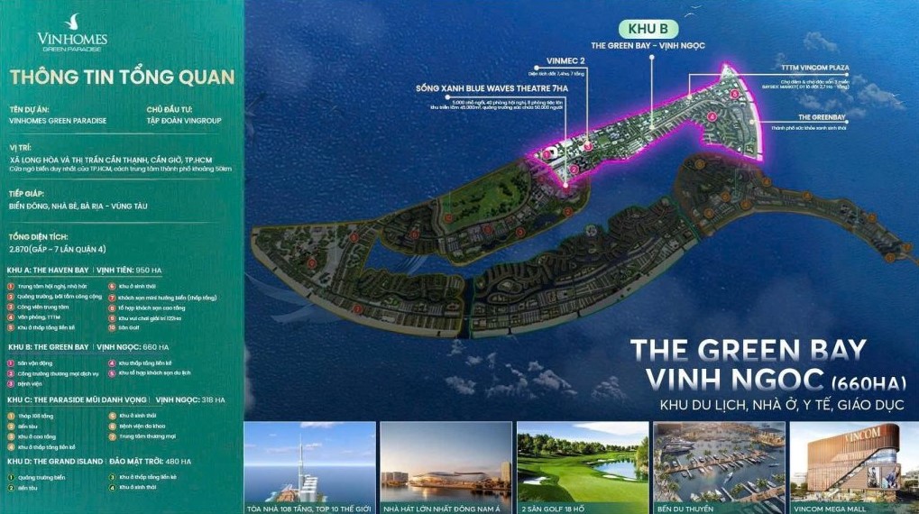 Phân khu The Green Bay (Vịnh Ngọc) tọa lạc tại vị trí trung tâm của mặt bằng Vinhomes Cần Giờ, đóng vai trò là tâm điểm an cư sinh thái. Phía Bắc giáp Vịnh Tiên, phía Nam giáp Mũi Danh Vọng và phía Đông hướng trọn ra biển. Đây là nơi hội tụ các giá trị sống bền vững, tập trung vào cộng đồng cư dân với mật độ mảng xanh và mặt nước lớn nhất dự án.