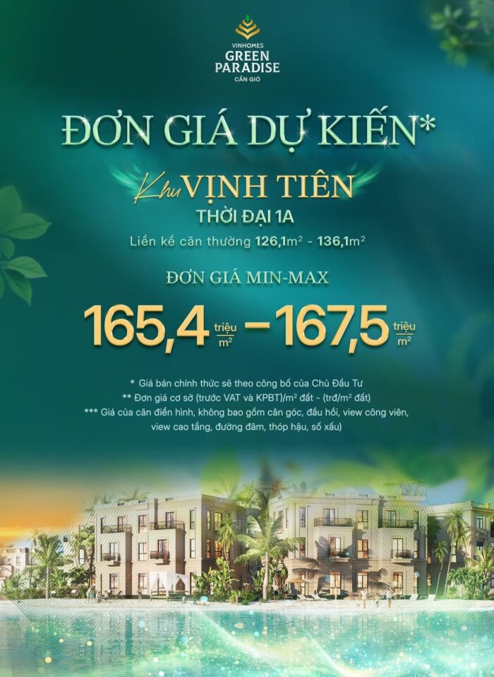 Trong bối cảnh bất động sản nội đô TPHCM liên tục lập đỉnh, mức giá bị đẩy lên quá cao so với giá trị thực mang lại, thị trường bắt đầu ghi nhận một sự dịch chuyển mạnh mẽ của dòng vốn ra những cấu trúc đô thị mới. Chính xu hướng này đã đưa Vịnh Tiên – khu cao cấp nhất tại Vinhomes Green Paradise (Cần Giờ) – trở thành tâm điểm tìm kiếm của nhà đầu tư khi mức giá dự kiến từ 134 triệu đồng/m² đất (chưa gồm VAT và phí bảo trì) được đánh giá là “đầy biên độ” so với tiềm năng tương lai.